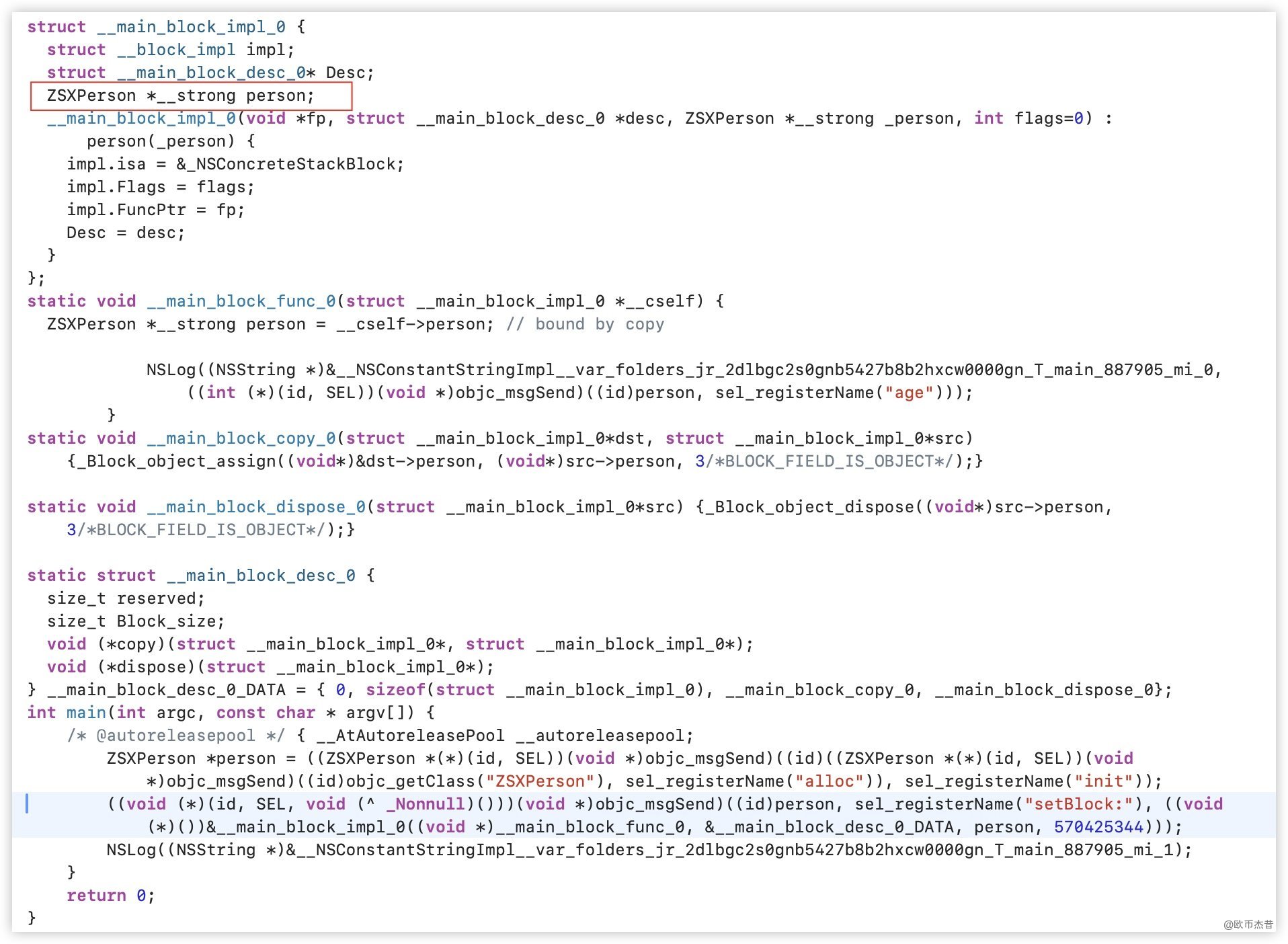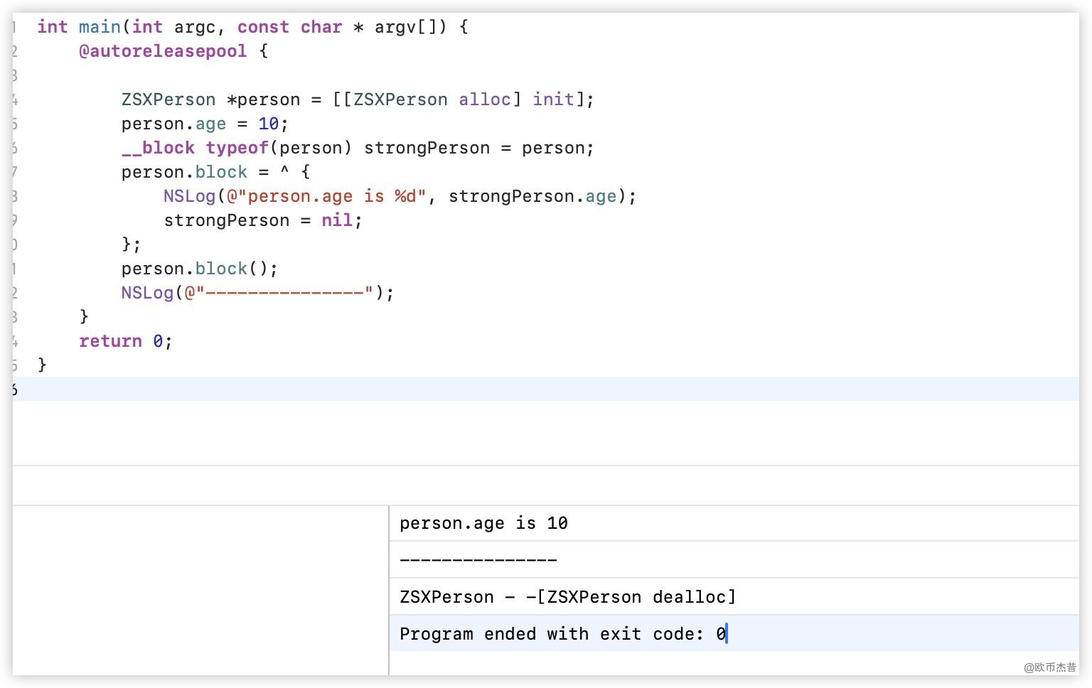 main.m 中初始化ZSXperson对象person,创建person的block,并在block里面访问person.age