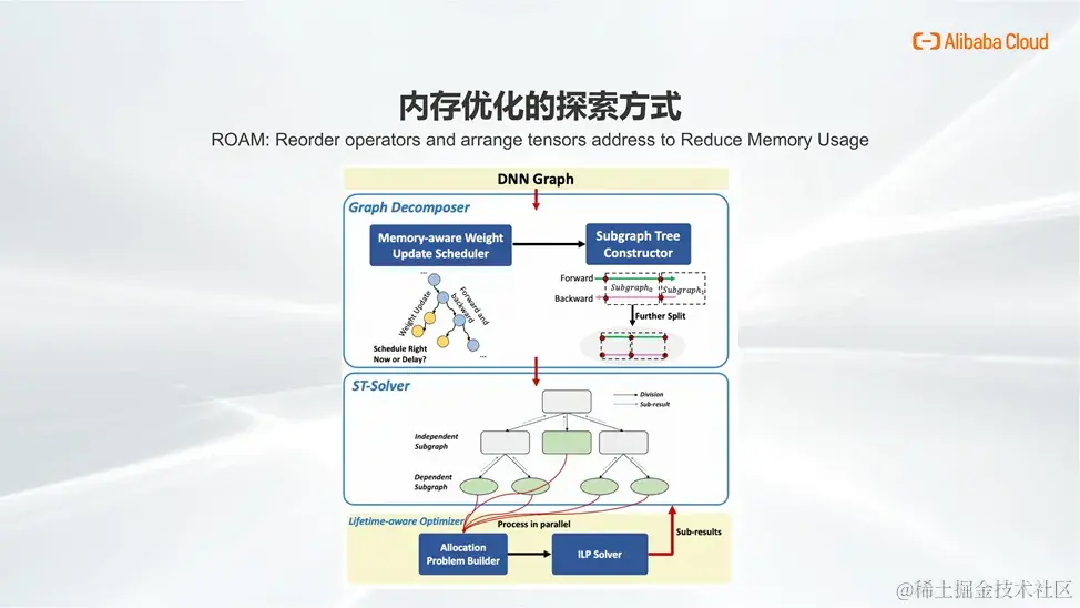 Graph 分割与局部优化:将大计算图根据关键节点 (memory insensitive operator) 分割成多个内存无关性的子图,子图间执行顺序固定,而子图内部的执行顺序则可以多样化。通过这种方式,可以将复杂的全局线性规划问题分解成多个局部问题,在子图范围内采用高效的优化方法,如线性规划求解最优执行顺序。