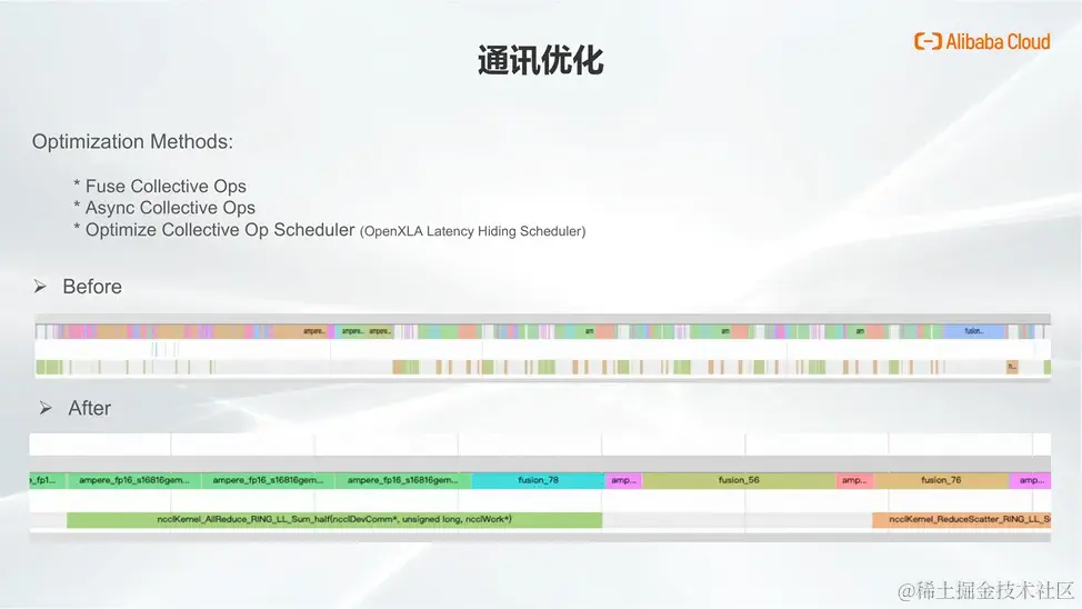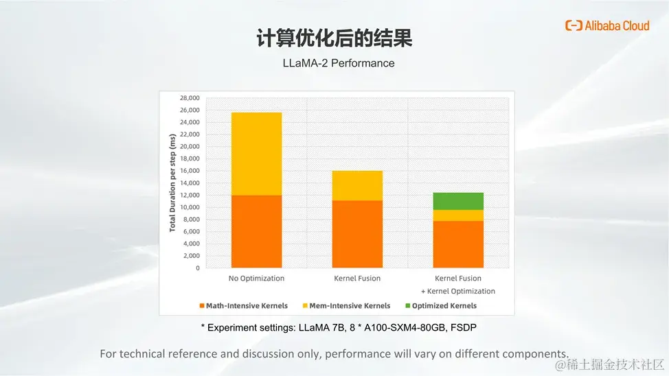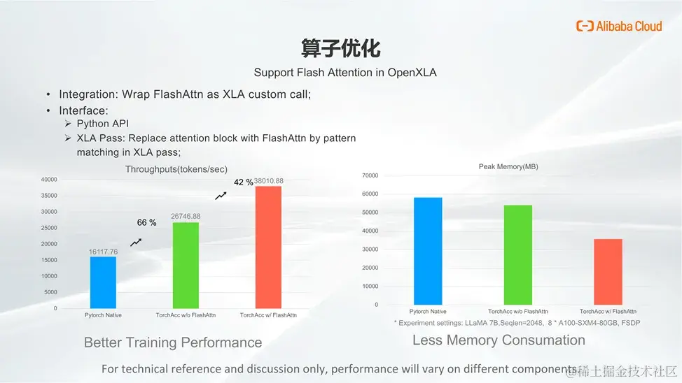 在 Llama 2-7B 模型的性能测试中,我们能够明显观察到上述计算优化带来的效果。通过利用 XLA 自身的优化技术,尤其是 kernel fusion,我们将大量的访存密集型算子做了有效合并,从而大幅减少其数量,在叠加 FlashAttention 后,优化性能进一步提升。