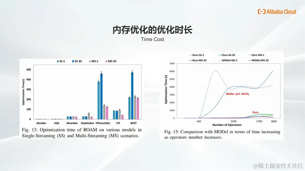 从另一个维度衡量效果,我们考察了算法求解的时间开销。实验证明,在常见的深度学习场景中,我们的优化算法能够在短短几分钟内得出优化结果。从右图所示对比中可以看出,相较于 Facebook 最近提出的 MODeL(一种基于线性规划的优化方法),我们的方法在求解时间上实现了显著的缩减。原因在于,MODeL 在处理大规模图时并未对其进行有效分割,而我们的方法通过引入 memory-aware weight update scheduler 和子图划分策略,有效地降低了优化问题的空间复杂度,从而提高了求解效率。