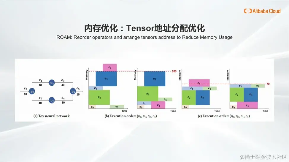 然而,如果我们能够预判并精细管理内存分配,即在分配地址时预知后续执行的算子序列,即可如 B 图右半部分所示进行更优的显存布局,使得整体计算可在有限显存内顺利完成。更进一步,通过精确控制执行顺序,比如按照 V0-V2-V1-V3 的方式执行,可以进一步压缩显存需求至原始需求的 70% 左右。