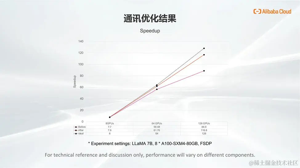 通过在 Llama2 -7B 模型上进行的端到端多机性能测试,我们发现,应用了通讯优化策略后,在 128 张 GPU 卡上进行分布式训练,优化后的加速比从原来的 88 提升到了 116,通过 timeline 图我们也可以直观地看到,优化后的通讯算子更加有序,并且能够更好地和计算重叠执行。