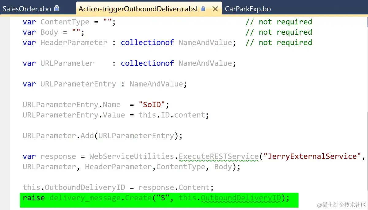 在 Cloud Application Studio 中,打开 MyCustomBO 的脚本文件,通常位于 Scripts 文件夹下的 AfterModify 事件中,添加如下 ABSL 代码: