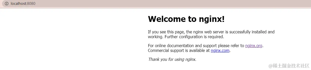 默认情况下,我们本机端口是80,本机IP是http://localhost/,因此我们访问http://localhost:8080/就可以访问nginx的主页了。(80端口可以省略不写)