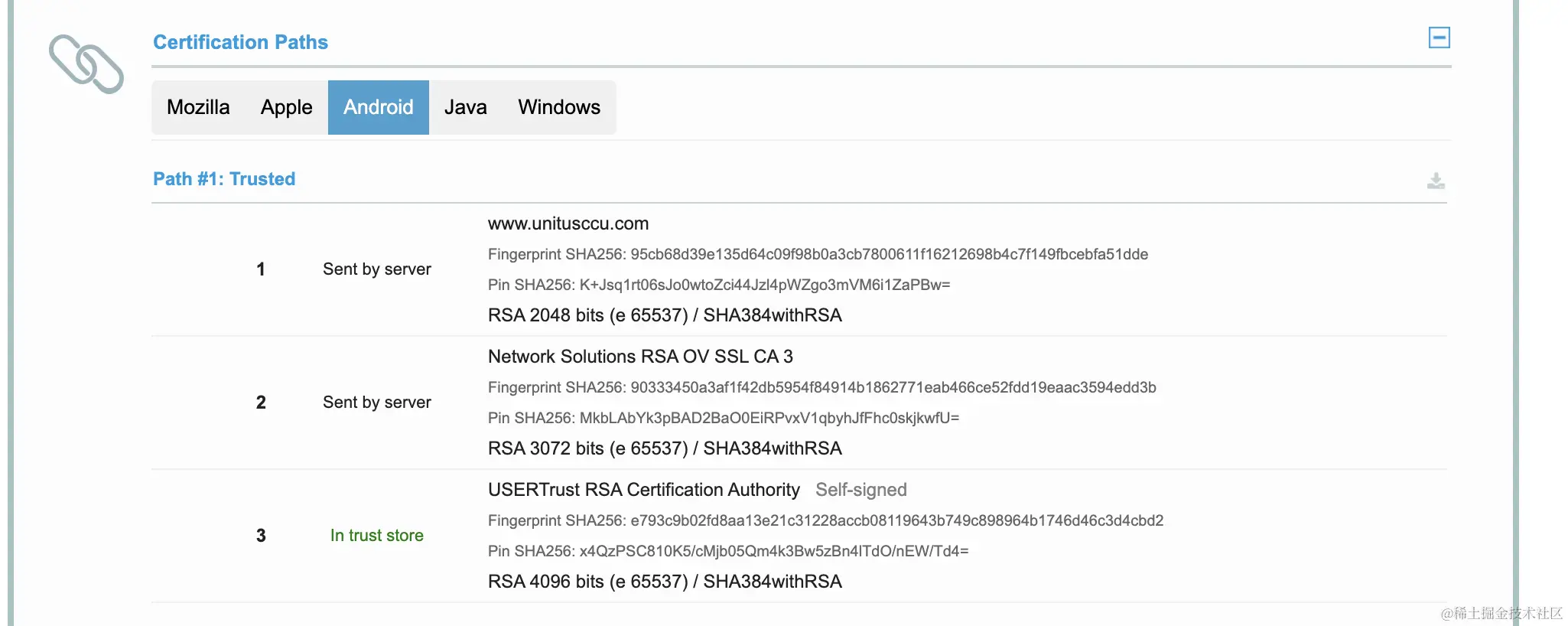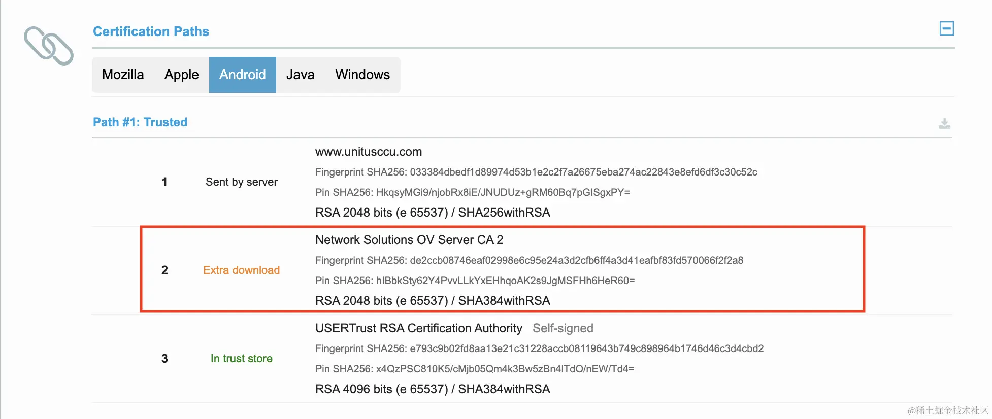 The "Extra download" in orange is the missing intermediate certificate which needs to be fetched by AIA. (the screenshot was obtained by running the SSL Server Test with host name www.unitusccu.com and expand on the "Certification paths").