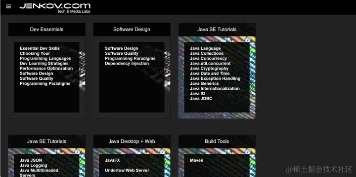 是一个国外的技术网站,里面提供了许多非常不错的Java教程。有志于进军Java卷王大军的朋友,如果英语勉强过关值得看看。(一看这酷黑的成熟风格,有没有很想学习的冲动?)