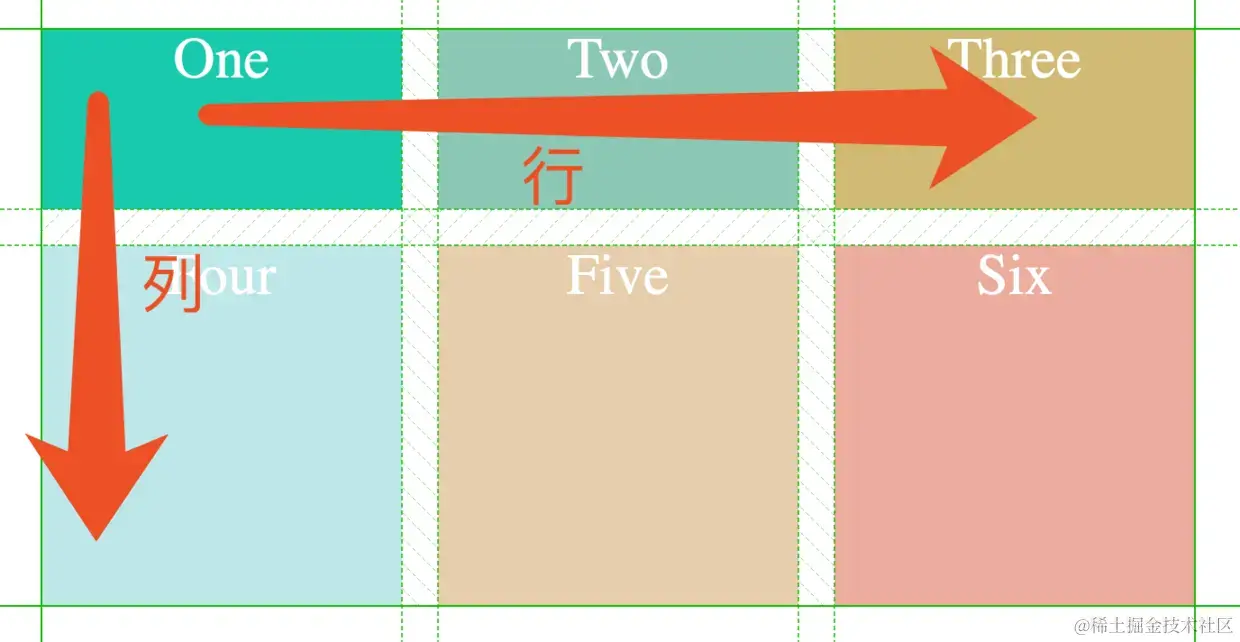 grid-template-columns和grid-template-rows属性来定义网格中的行和列。容器内部的水平区域称为行,垂直区域称为列。上图中One、Two、Three组成了一行,One、Four则是一列
