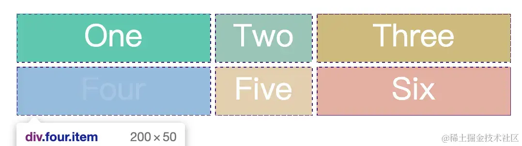 上面代码中,类 .two 所在的网格项目,垂直网格线是从 2 到 4,水平网格线是从 1 到 2。其中它跟 .three (垂直网格线是从3 到 4,水平网格线是从 1 到 4) 是有冲突的。可以设置 z-index 去决定它们的层级关系