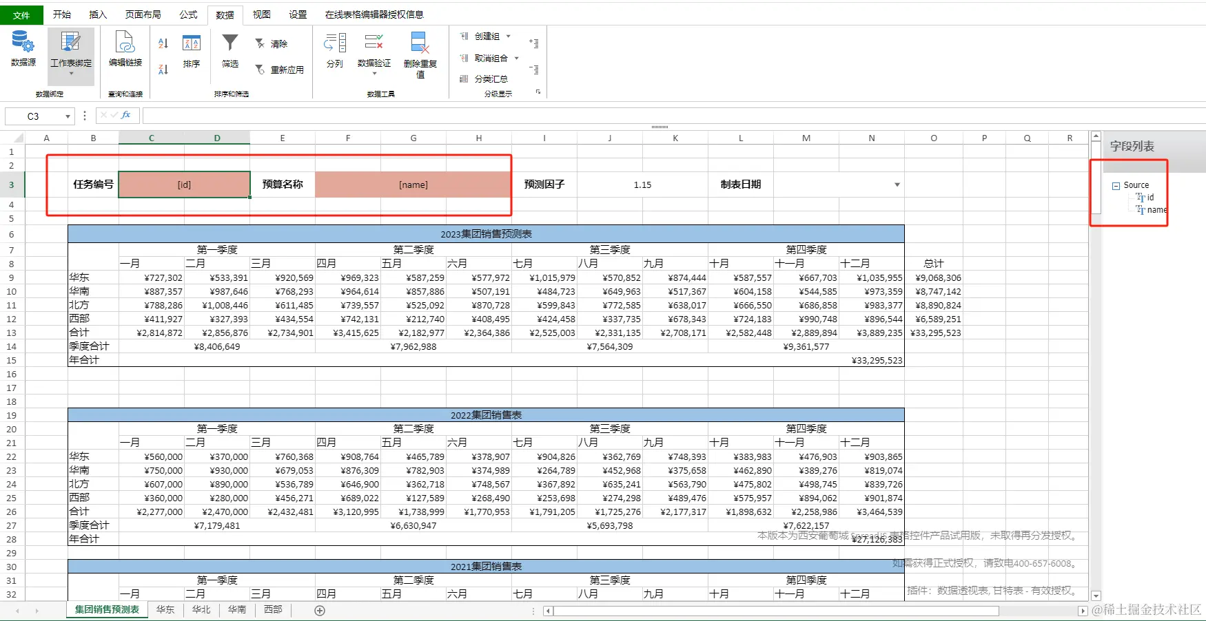 这个时候就看到了华东部门经理填写的销售预测数据,这个时候点击右上角的“导入年度实际销售数据”看看。