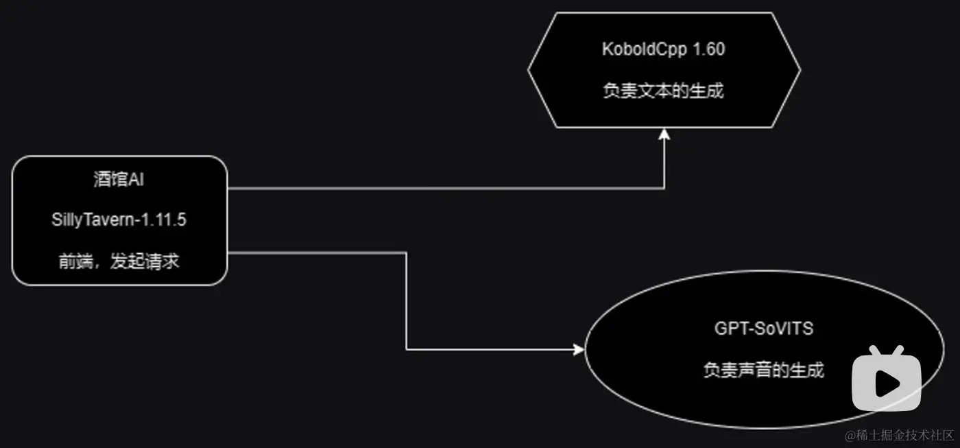 这里SillyTavern作为前端负责向后端的Koboldcpp发起请求,Koboldcpp流式返回文本,SillyTavern接受聊天文本进行展示,当文本接受完毕后,SillyTavern再次向后端的GPT-SoVITS发起请求,将全量文本传递给后端GPT-SoVITS,GPT-SoVITS根据文字来生成语音,并将语音的二进制文件返回给SillyTavern,最后SillyTavern播放音频,至此,一个完整的流程就走完了。