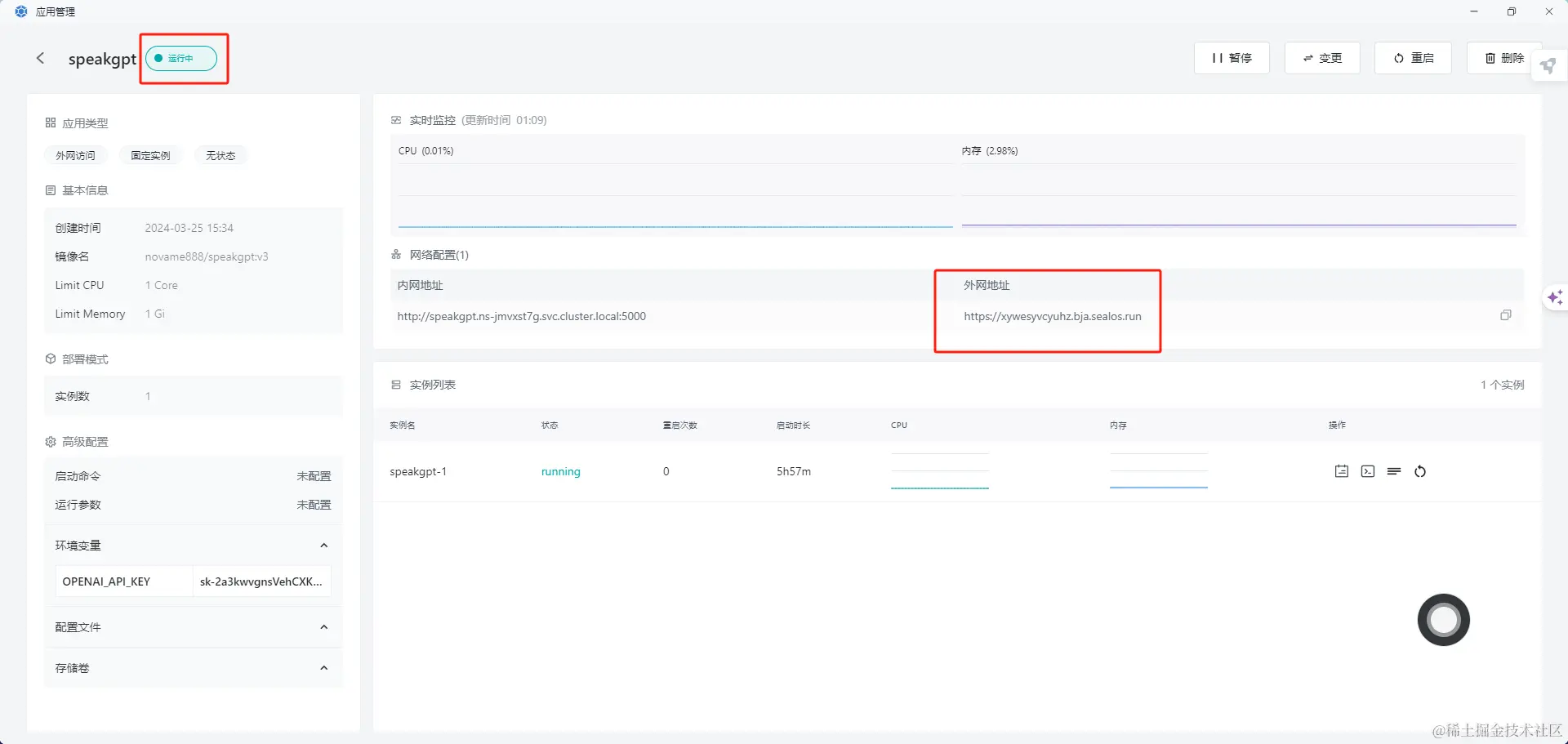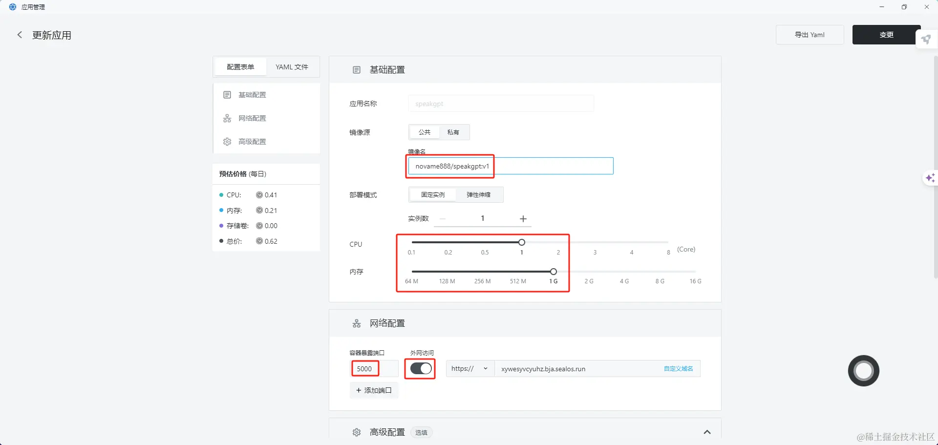 这里的镜像换成你自己的,我的是: novame888/speakgpt:v1 就是上面提到的。