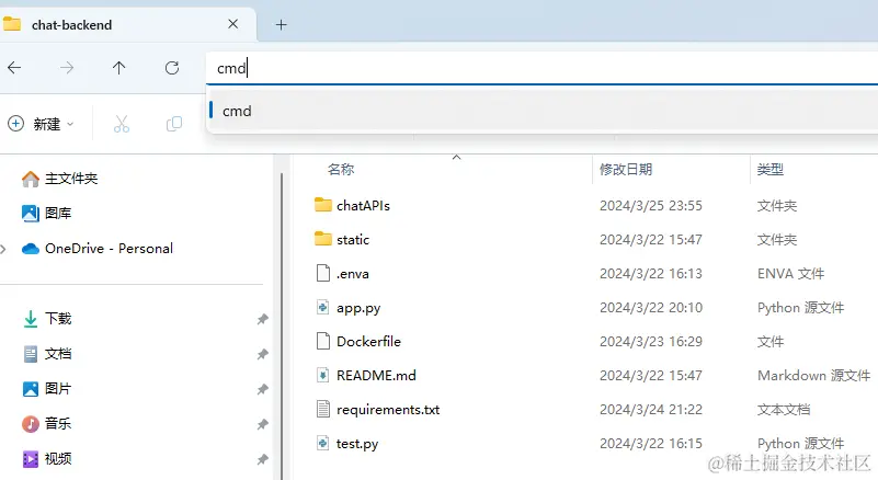 在项目 chat-backend 根目录 路径栏 (蓝色的字)输入 【cmd】 三个字母。
