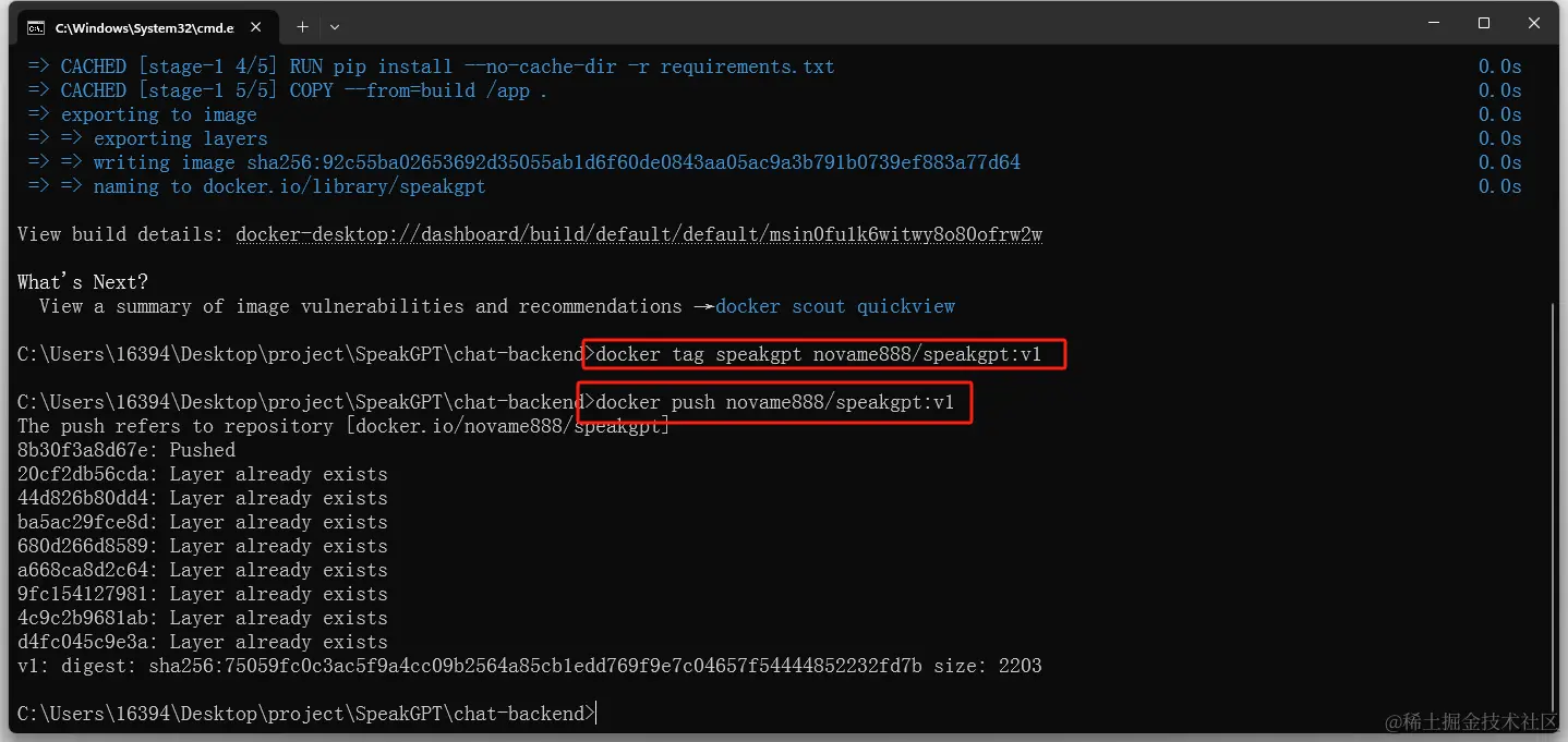 这里的speakgpt 和上面一样,novame888 改成你的账号,后面的speakgpt 可以和前面一样,也可以不一样,英文冒号后面的v1 是标签,可以换成你想要的标签。可以用来区分版本。