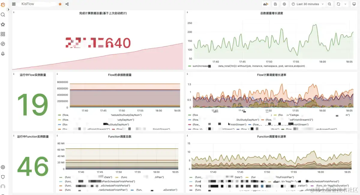 既然有了Prometheus的指标统计,我们可以给KisFlow的流式计算程序结合Grafana进行看板展示。 由于各个开发者的项目的统计指标和看板要求不一定相同,这里本文就不提供具体的Grafana看板的配置文件了,下面提供一个KisFlow的项目看板,作为演示参考,如下: