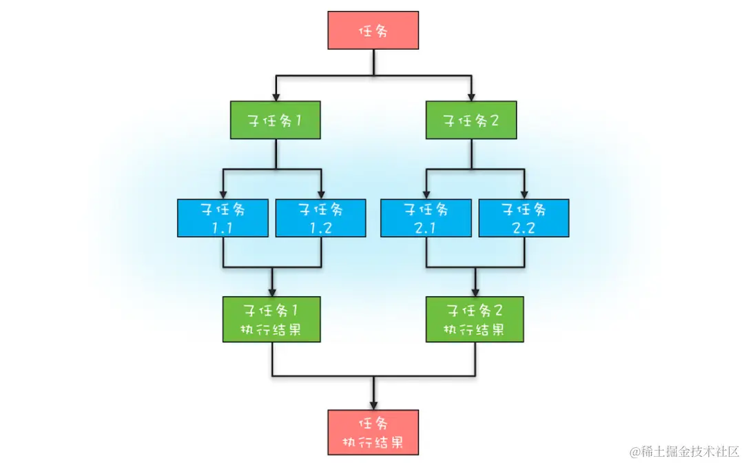 分治任务模型可分为两个阶段:一个阶段是 任务分解,就是迭代地将任务分解为子任务,直到子任务可以直接计算出结果;另一个阶段是 结果合并,即逐层合并子任务的执行结果,直到获得最终结果。下图是一个简化的分治任务模型图,你可以对照着理解。