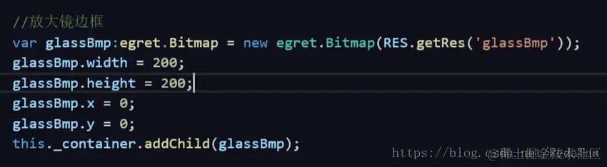3.5 再把同事帮P的金丝镶边的放大镜边框放进去:(此处图片资源glassBmp与步骤2中resource/default.res.json里边放大镜图片name值不同,调用时一定要设置成一样的)