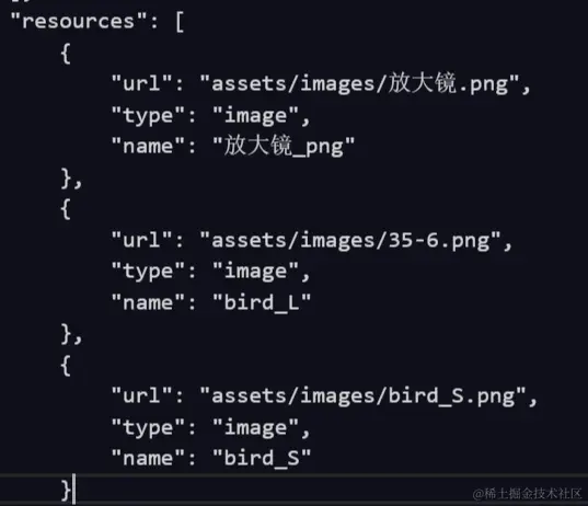 2.图片素材准备好之后,在项目配置文件resource/default.res.json中会自动将图片信息存储进来,方便使用,可自行设置图片信息(name/type);