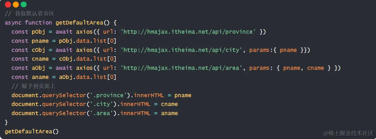 const aObj = await axios({ url: 'http://hmajax.itheima.net/api/area', params: { pname, cname } })