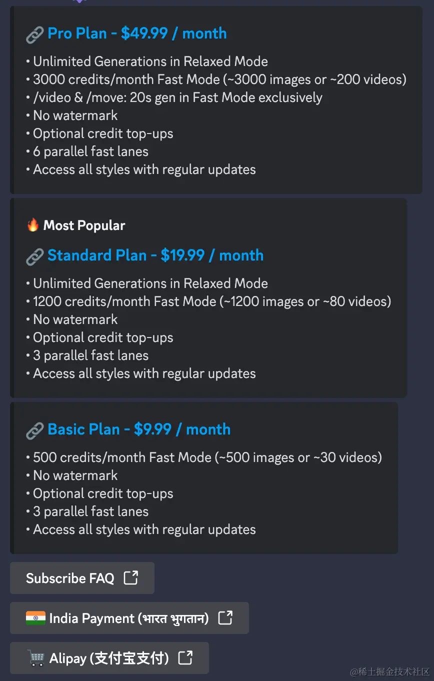 输入 /subscribe 可查看不同订阅计划的价格和额度说明。
