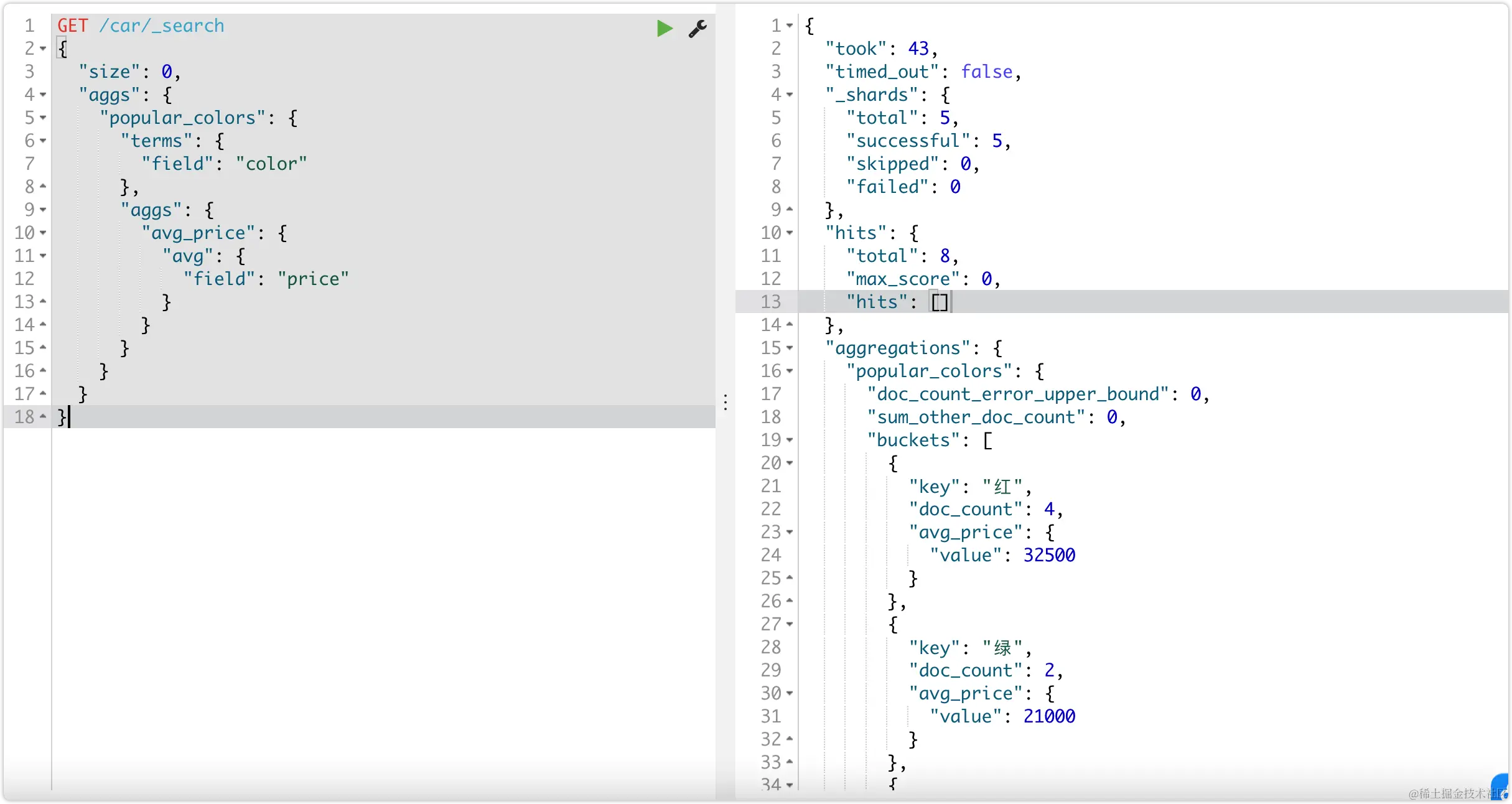 首先,我们按照汽车的颜色color来划分桶,按照颜色分桶最好是使用Term Aggregation类型,按照颜色的名称来分桶。语法格式见下: