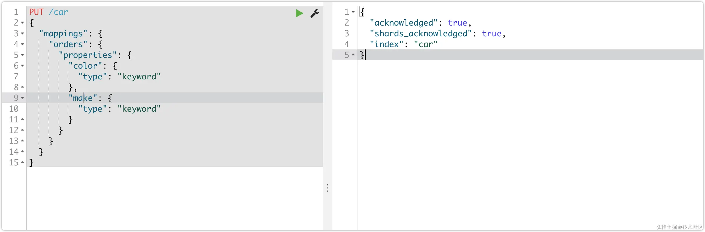 注意:在Elasticsearch中,需要进行聚合、排序、过滤的字段其处理方式比较特殊,因此不能被分词,必须使用keyword或数值类型 。这里我们将color和make这两个文字类型的字段设置为keyword类型,这个类型不会被分词,将来就可以参与聚合。