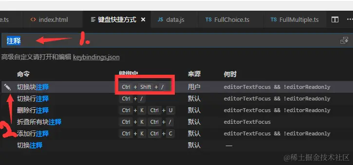 1.搜索“注释”,可以看到原有的“切换块注释”(我的已经修改过了);