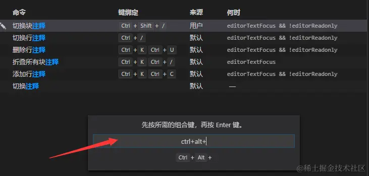 2.点击2位置修改快捷键绑定,出现如下编辑框时直接按键盘中想要设置的快捷键组合(例如:按住Ctrl+Shift+/)回车即可保存成功。