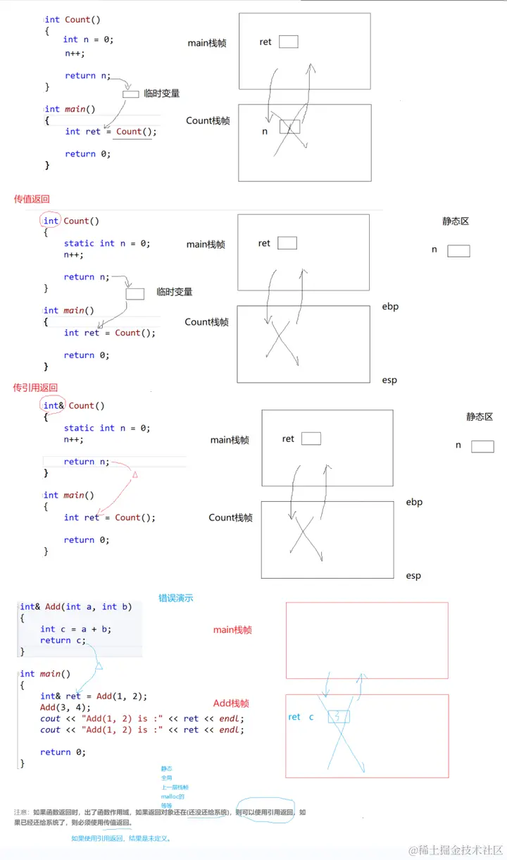 第一种是没有static,count的函数栈帧结束后,n的值传给临时变量,这个临时变量是在寄存器或者main函数里面开辟的,此时count函数栈帧被销毁还给操作系统,临时变量再赋值给main函数中的ret。