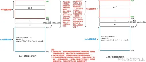 int& ret = Add(1, 2);//这里的&去掉,ret依然是c的别名,函数结束后c依然还给了操作系统,ret一定是未知,当然有可能对,取决于第一次栈帧销毁时c的值。