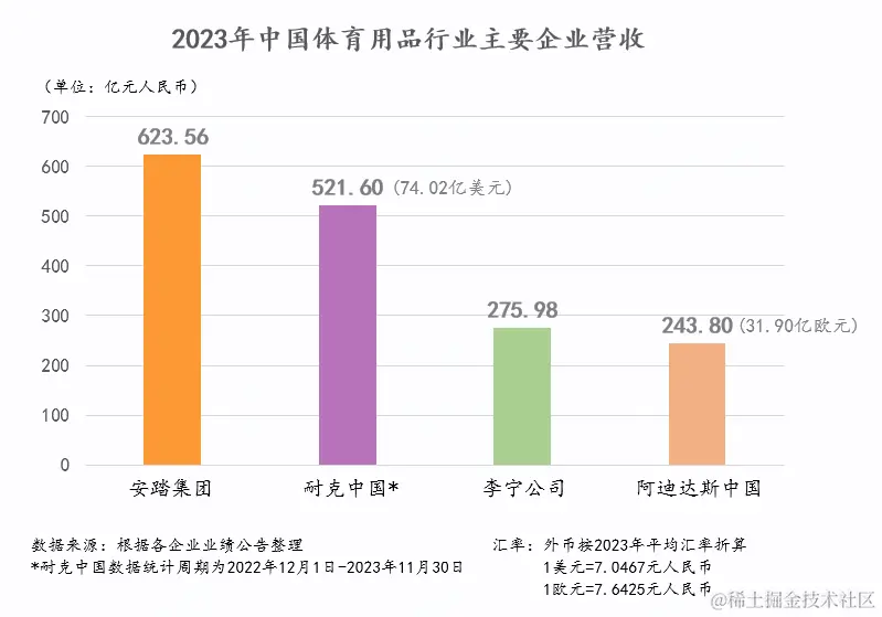 **不仅如此,安踏集团还以中国体育用品行业领跑者的地位,给中国企业的发展树立着标杆。**目前的前四名企业中,安踏集团+李宁公司的营收之和达到耐克中国+阿迪中国的1.18倍,在中国体育用品行业的主场,安踏引领了逆转。