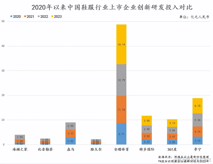 安踏集团维持高研发水平的时间段,也是它完成从追赶到超越的时间段,研发推动了业绩走向新高。而在四家主要企业角度上,它们近年来转型力度颇大,显然也和安踏集团在研发方面的示范作用不无关系。