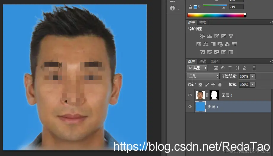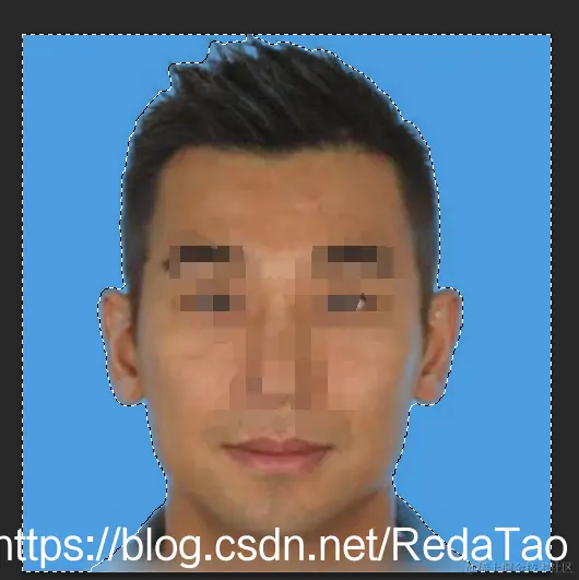 7. 边缘全部刷出来之后,点击确定,退出蒙版界面,然后新建图层,给新图层设置成别的颜色(蓝色,色值:#338fdb),可在图层面板中点击白色图层,然后按住ctrl+delete(设置背景色,前景色为Alt + delete)键进行染色,调整图层位置,如图所示: