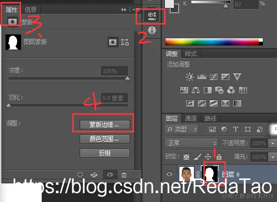 5. 点击图层面板中的 蒙版 ,然后点击 属性 面板中的蒙版边缘