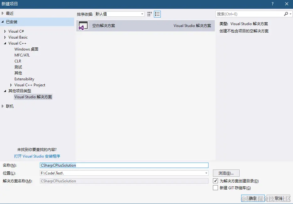新建解决方案->CSharpCPlusSolution