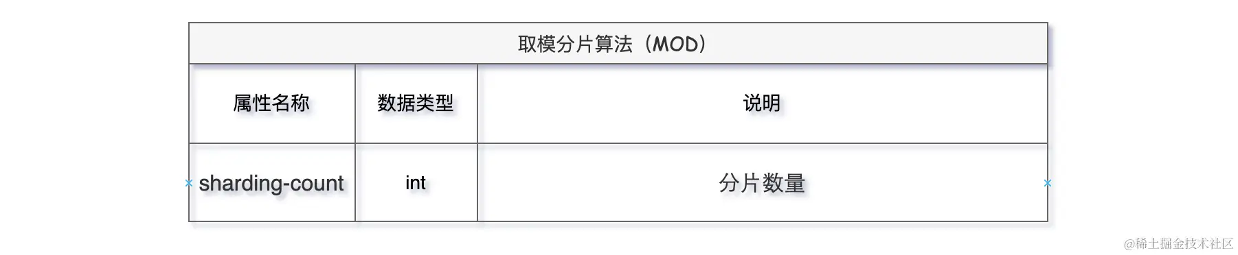 取模分片算法是内置的一种比较简单的算法,定义算法时类型MOD,表达式大致(分片健/数据库实例) % sharding-count,它只有一个 props 属性sharding-count代表分片表的数量。