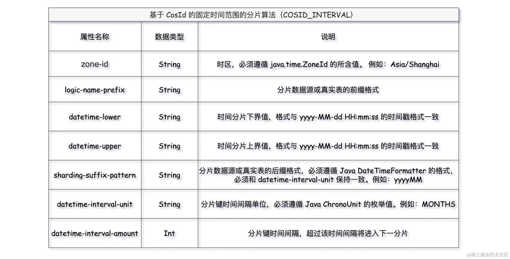 基于 CosId 的固定时间范围的分片算法,和INTERVAL算法的用法很相似,不同点在于增加了zone-id时区属性,logic-name-prefix分片数据源或真实表的前缀格式,上下界datetime-lower、datetime-upper范围的时间格式是固定的yyyy-MM-dd HH:mm:ss。