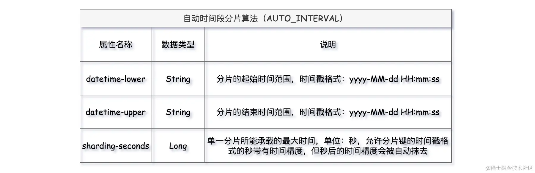 datetime-interval-unit: "MONTHS" # 分片键时间间隔单位,必须遵循 Java ChronoUnit 的枚举值。例如:MONTHS