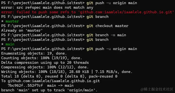 执行git init 命令时,重新初始化现有git仓库,而默认的主分支名称为master,现在github上默认分支名从master变为main了,因此发生此错误