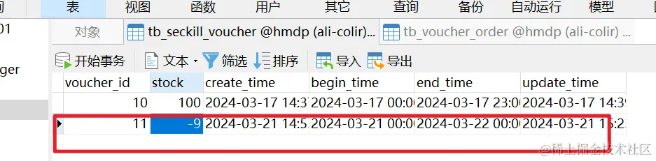 回到数据库看一下,数据库的库存出现了负数,这是一个典型的超卖问题。