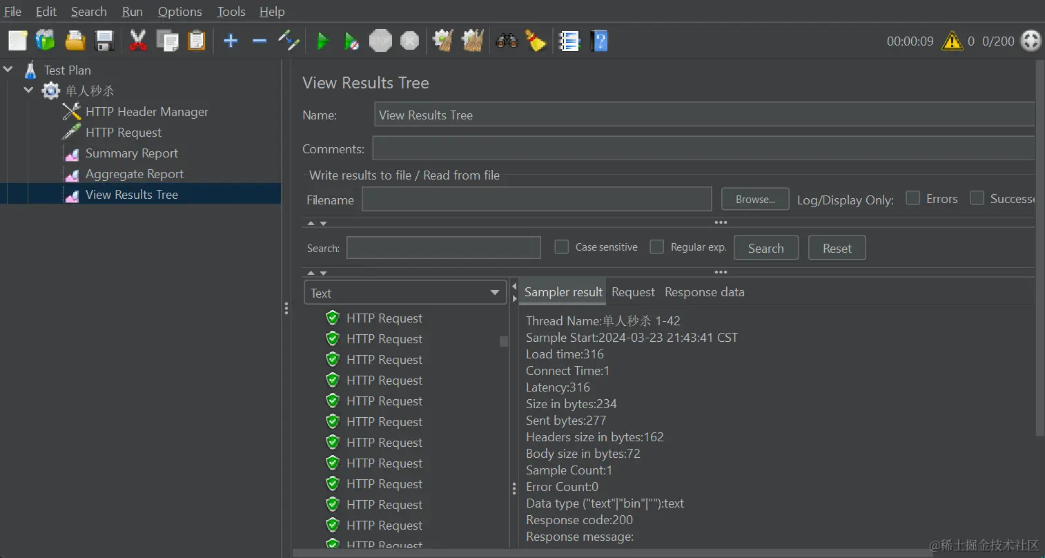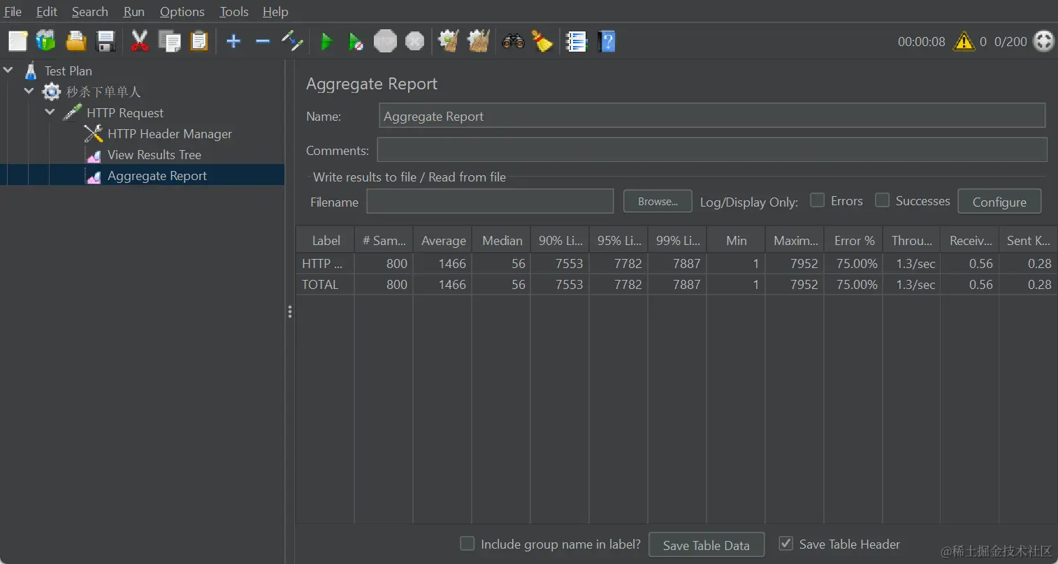 一个基础的用户抢购下单流程是这样子的,在没有经过任何处理的时候,我们使用jmeter模拟多线程,进行压测,可以发现会在这个汇总变中,明显可以看见不是所有请求都成功的。