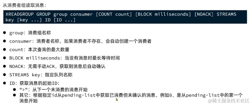 - 消息确认:消费者获取消息后,消息处于pending状态,并存入一个pending-list。当处理完成后需要通过XACK来确认消息,标记消息为已处理,才会从pending-list移除