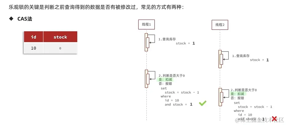 - 乐观锁:认为线程安全不一定会发生,不会加锁,只是在更新数据时去判断有没有其他线程对数据做修改,没有修改则安全,自己更新数据,如果被其他线程修改,说明发生安全问题,此时可以重试或异常。
