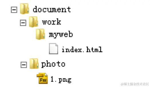 现在document是最大的文件夹,里面有两个文件夹work和photo。work中又有一个文件夹叫做myweb。myweb文件夹里面有index.html。 所以index.html在myweb文件夹里面,上一级就是work文件夹,上两级就是document文件夹。通过document文件夹当做一个中转站,进入photo文件夹,看到了1.png。
