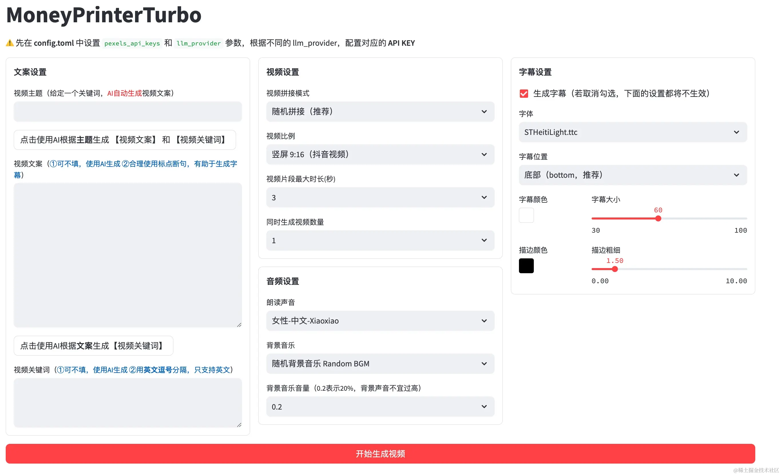 按照配置文件(如下配置)中的说明,配置好 pexels_api_keys 和 llm_provider,并根据 llm_provider 对应的服务商,配置相关的 API Key.