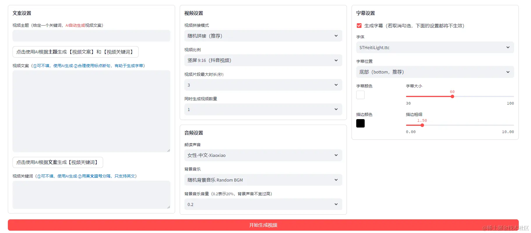 输入视频主题、视频文案(可选),其他的一些视频设置进行自定义修改,设置完毕后点击开始生成视频,就可以开始生成视频了!