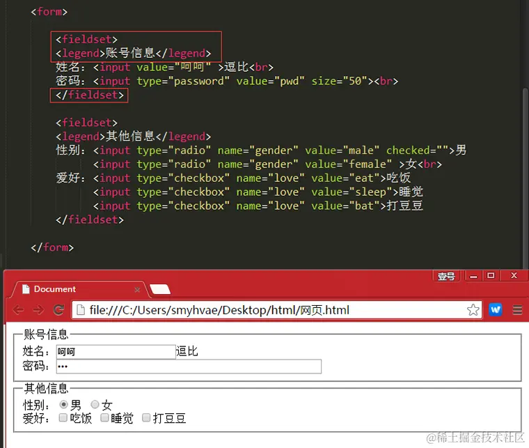 比如,我们在注册一个网站的信息的时候,有一部分是必填信息,有一部分是选填信息,这个时候可以利用表单的语义化。 举例: