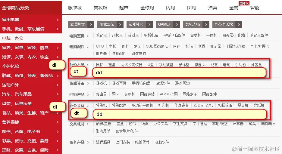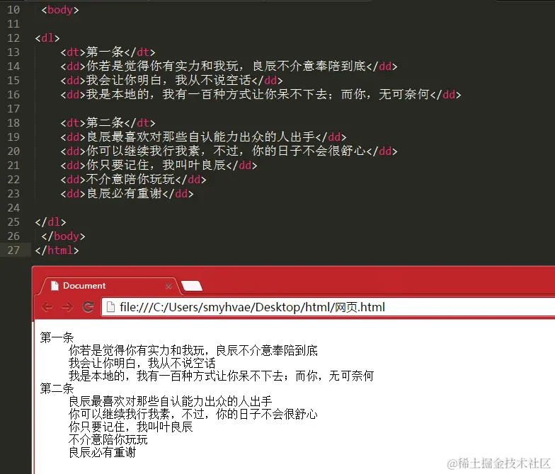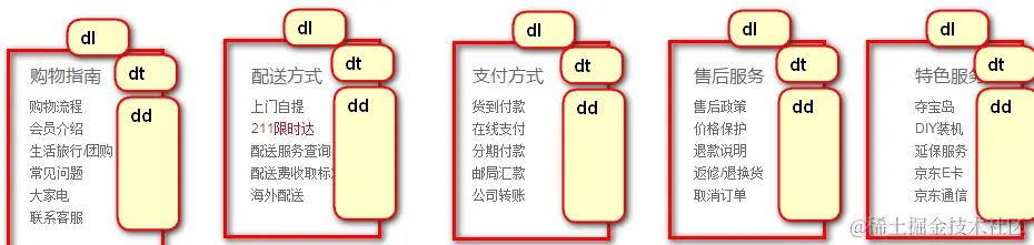 备注:dt、dd只能在dl里面;dl里面只能有dt、dd。
