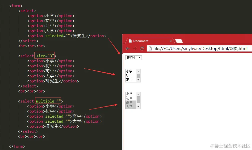 multiple:可以对下拉列表中的选项进行多选。属性值为 multiple,也可以没有属性值。也就是说,既可以写成multiple="",也可以写成multiple="multiple"。size="3":如果属性值大于1,则列表为滚动视图。默认属性值为1,即下拉视图。