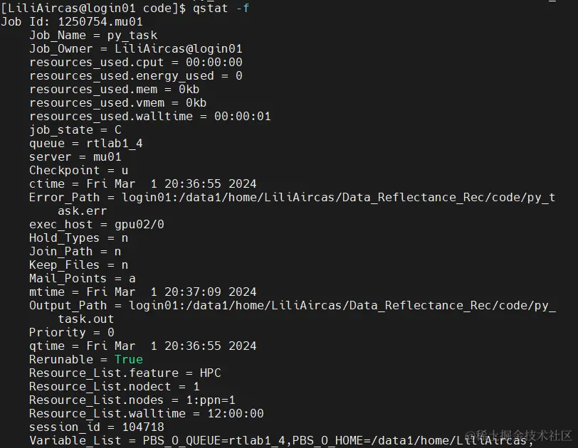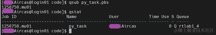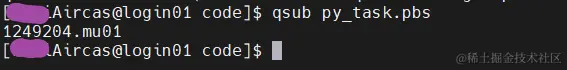 上述代码会将我们前述编辑好的PBS脚本文件py_task.pbs提交到PBS作业调度系统中,并开始等待系统分配资源,从而执行作业。执行上述代码,如下图所示。