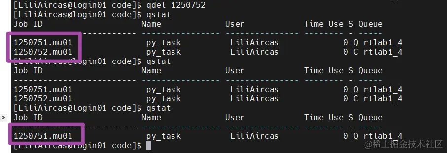 执行上述代码,并在执行前后通过qstat命令查看队列中的任务,可以看到指定的任务已经被删除了——但是有延迟:执行完qdel后立刻执行qstat的话,可以看到1250752这个任务还是在的;稍后再执行qstat,才可以看到1250752任务消失。